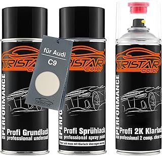TRISTARcolor Autolack 2K Spraydosen Set für Audi C9 Perlmuttweiss Metallic/Perlmutt Weiss Metallic Grundlack Basislack 2 Komponenten Klarlack Sprühdose